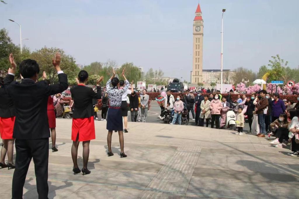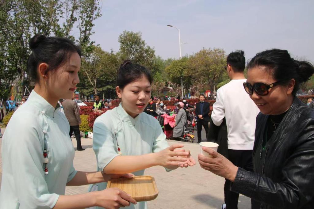 4月8日上午,球速体育茶艺社和蓝天梦空乘社在樱花大道和世纪广场进行了茶艺和民航礼仪展示。